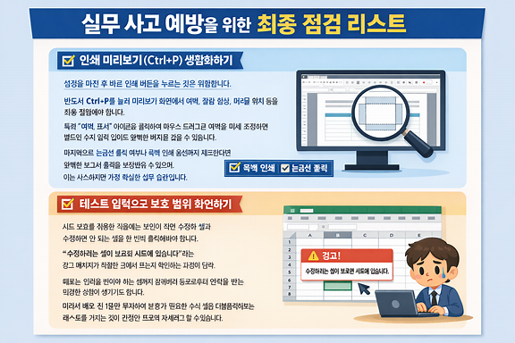 업무 효율을 높이는 엑셀의 숨은 기술! 인쇄 시 표가 잘리는 현상을 해결하는 페이지 레이아웃 최적화와 중요한 데이터 및 수식을 보호하는 시트 보호 설정법을 마스터하세요. 머리글/바닥글, 인쇄 제목 반복, 특정 셀 수정 제한 등 실무 사고를 예방하는 필수 보안 기법을 6가지 단계로 상세히 정리해 드립니다.