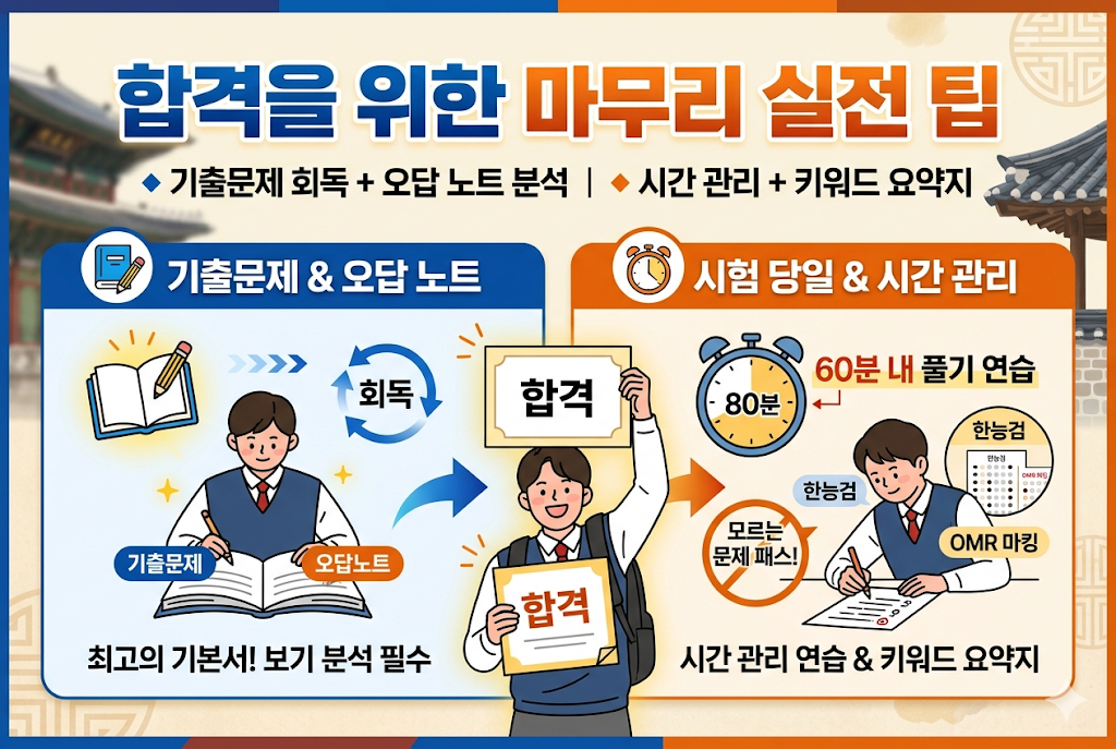 한능검은 '문제 은행' 방식이 일부 적용되기에 기출문제가 곧 최고의 기본서입니다. 최근 10회분 정도의 기출을 반복해서 풀다 보면, 선택지(보기)가 재활용되는 것을 발견할 수 있습니다. 틀린 문제뿐만 아니라 맞힌 문제라도 헷갈리는 보기는 반드시 개념을 재확인해야 합니다. 오답 노트를 만들 때 정답만 적지 말고, 나머지 오답 보기들이 어느 시대, 어느 사건에 해당하는지 분석하는 습관이 점수를 수직 상승시킵니다.